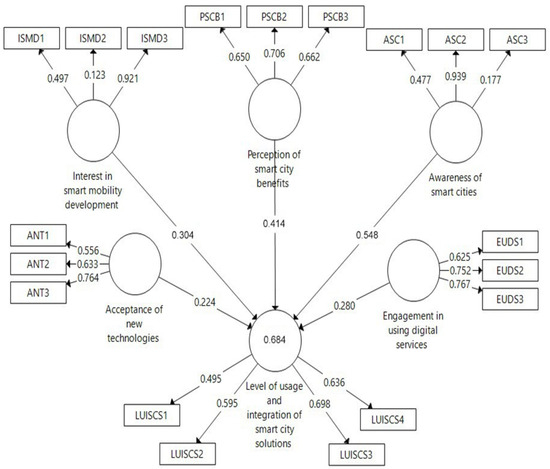 The analysis revealed statistically significant relationships between the examined latent variables, confirming the importance of various factors in the usage and integration of smart city solutions. A notable finding was the positive effect of acceptance of new technologies (ANT) on the level of usage and integration of smart city solutions (LUISCS) (β = 0.224, t = 5.34, p = 0.000). This result indicates that individuals who are more open to adopting new technologies are also more likely to integrate smart city solutions into their daily lives. Additionally, awareness of smart cities (ASC) plays a crucial role, as higher awareness significantly contributes to increased usage of smart city technologies (β = 0.548, t = 7.61, p = 0.005). This suggests that when citizens are more informed about smart city initiatives and their benefits, they are more likely to embrace these innovations. Moreover, engagement in the use of digital services (EUDS) was found to have a strong impact on the adoption of smart solutions (β = 0.280, t = 6.02, p = 0.000). The more citizens actively engage with digital city services, the more likely they are to integrate other smart city technologies, further enhancing their daily urban experience. Interest in smart mobility development (ISMD) also emerged as a significant driver of smart city integration (β = 0.304, t = 4.54, p = 0.003). This finding highlights that individuals who show interest in innovative mobility solutions, such as electric scooters or smart public transportation systems, tend to be more proactive in incorporating smart technologies into their routines. The perception of smart city benefits (PSCB) was shown to have the strongest effect on smart city solution integration (β = 0.414, t = 8.81, p = 0.002). When citizens clearly recognize the benefits of smart city technologies—such as improved mobility, energy efficiency, and enhanced quality of life—they are more likely to adopt and integrate these solutions (Table 7).