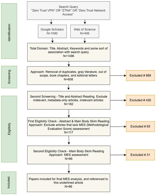 - Identification phase: The review began with the identification phase, where an initial search was conducted using the query “Zero Trust VPN” OR “ZTNA” OR “Zero Trust Network Access” to capture the literature related to Zero Trust and VPN concepts. Two major academic databases, Google Scholar and Web of Science, were used to gather a comprehensive set of articles. This search returned 1090 results from Google Scholar and 406 from Web of Science, resulting in a total of 1496 papers.