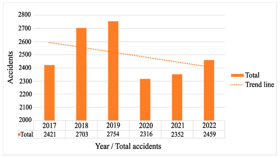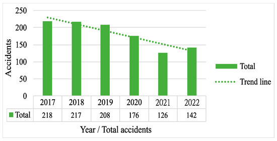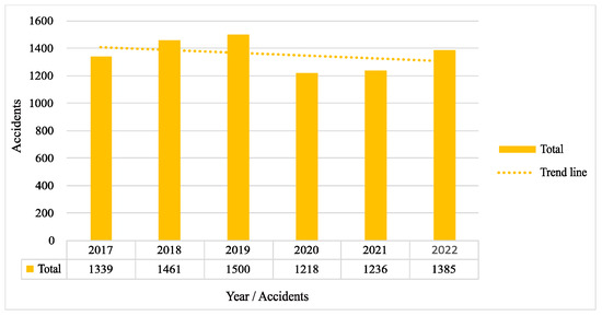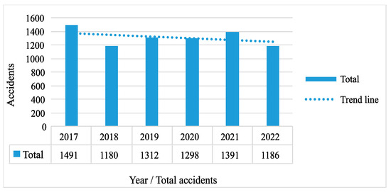 Bar graphs are presented in Figure 2, Figure 3, Figure 4 and Figure 5 to understand the trend for accidents registered in the six years evaluated, and to analyze the trend from the past to the current state, as proposed by the benchmarking method.