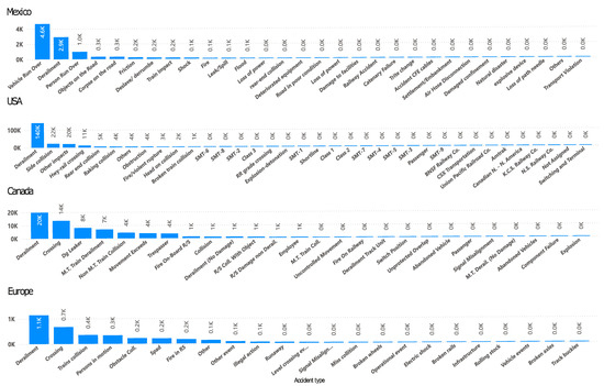 Figure 6 presents a bar graph of the frequency of railway accidents recorded over the six years analyzed. The bar graph facilitates a visual understanding of the trends and classification of accidents and also highlights the most common types of railway accidents in Mexico, the United States, Canada, and the European Union.