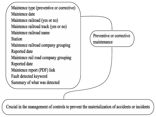 - Preventive and corrective maintenance: This allows for identifying if there was a history of failures before the accident. It provides a deep database that could be used in the future to apply artificial intelligence techniques to estimate the remaining useful life [38,39] of critical components.