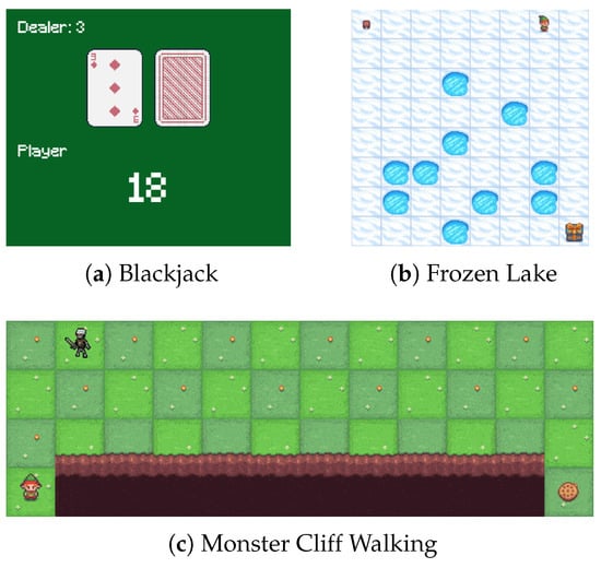 Blackjack is a popular single-player card game played between a player and a dealer. The objective is to obtain a hand value closer to 21 than the dealer’s hand value—without exceeding 21 (going bust). We follow the game rules defined by Sutton and Barto []. Each face card counts as 10, and an ace can be counted as either 1 or 11. The Blackjack environment (https://gymnasium.farama.org/environments/toy_text/blackjack/, (accessed on 10 November 2024)), of Gymnasium represents a state based on three factors: (1) the sum of the player’s card values, (2) the value of the dealer’s face-up card, and (3) whether the player holds a usable ace. An ace is usable if it can count as 11 points without going bust. Each state allows two possible actions: stand (refrain from drawing another card) or hit (draw a card).