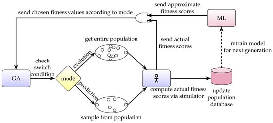 After a predefined switch condition is met, the algorithm transitions from evolution mode to prediction mode. In prediction mode, actual (in-simulator) fitness scores are computed only for a sampled subset of the population. For the rest of the population, the GA assigns approximate fitness values using a learned ML model that was trained on the existing population dataset. In prediction mode, a sample of the population receives true fitness scores per generation, and the rest of the generation’s individuals receive approximate fitness scores. This method is referred to as individual-based controlled evolution []. The algorithm can switch back and forth between evolution mode and prediction mode, enabling dynamic adaptation to the evolutionary state.