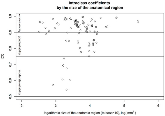 Intraclass correlation coefficients (ICCs) by size of anatomical region. All regions with only moderate reliability are in the lower third of the size spectrum.