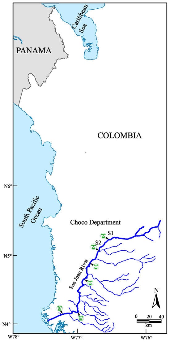 The San Juan River, located in the department of Chocó, Colombia, is one of the most important bodies of water in the Pacific region. With an approximate length of 380 km, it rises on the slopes of the western mountain range and flows through dense jungle areas before emptying into the Pacific Ocean. This river is characterized by its fast-flowing waters and a basin that covers one of the largest areas in the country. Its basin is located in one of the rainiest regions on the planet, which considerably increases its flow at certain times of the year [38].