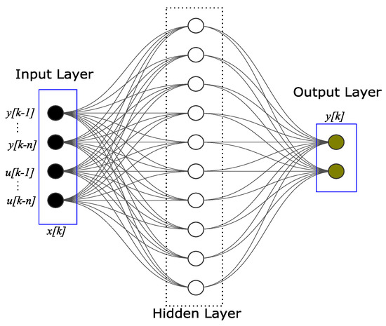 where the dimensions of identity matrices and are and , respectively, and is the additive noise at time instant k. In order to approximate the nonlinear function of (3), the nonlinear function is approximated by using a neural network structure, , where the NARX model can be defined as follows: