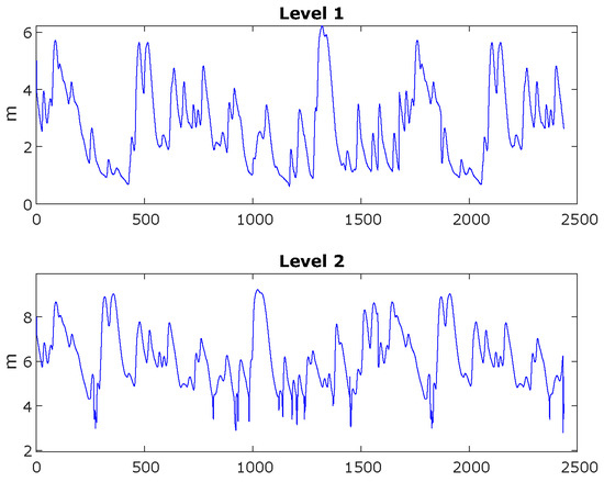For this study, only a sample corresponding to 1219 days with records every 12 h is considered, resulting in a total of 2438 data per station for each of the mentioned variables. The following figures describe the real measurements used for data forecasting for the hydrological variables of water level, water flow, and precipitation. Figure 3 shows the sample data of the level variable of the two hydrological stations.