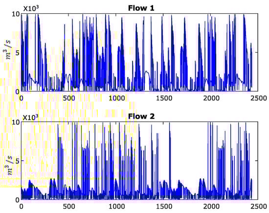 where and correspond to the two outputs of the water level variable of the two stations; and , , , and are the four inputs of the hydrological model, where represents the input of the water flow variable of the two stations, and represents the input of the precipitation variable of the two stations already mentioned. In addition, describes the state vector related to past inputs and outputs, with n being the system order.