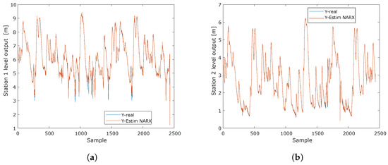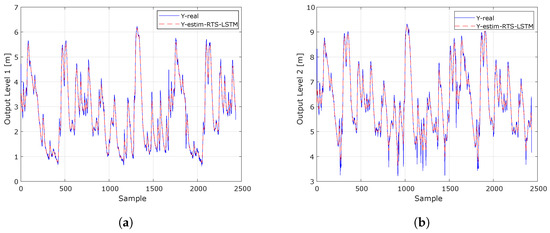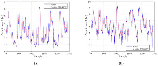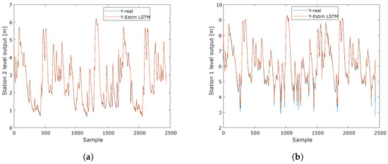 The results obtained for the LSTM model applied to both water level outflows can be seen in Figure 12. Specifically, Figure 12a illustrates the short-term estimates for the first water level output, comparing the estimated signal with the actual measurements. Similarly, Figure 12b presents the short-term prediction for the second water level output, together with the corresponding actual measurements, allowing for the accuracy of the model to be evaluated.