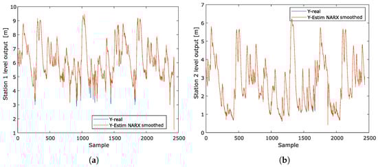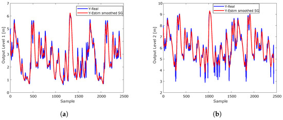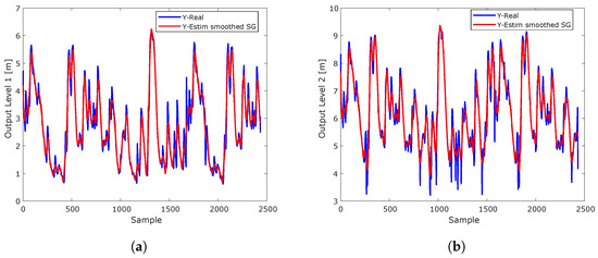 The Savitzky–Golay smoothing filter in Figure 10 for the two outputs shows how the method smoothes the fluctuations of both data series, removing noise and preserving important trends and patterns. This type of plot is useful for observing the evolution of water levels at two measurement points, highlighting underlying variations without distorting peaks or sharp changes that may be relevant to the analysis. Figure 10a shows the response for the first water level output; Figure 10b shows the response for the second water level output with the Savitzky–Golay smoothing filter.