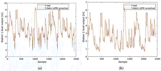 The Savitzky–Golay smoothing filter coupled to an LSTM network for two outputs, as presented in Figure 14, illustrates how the method can reduce noise in the data and improve the accuracy of the LSTM model in predicting water level trends. This approach combines the filter’s ability to preserve relevant patterns with the ability of the LSTM to capture long-term dependencies in time series. In Figure 14a, the first smoothed water level output is shown, and in Figure 14b, the second output is shown, providing a more accurate and robust prediction of water levels.