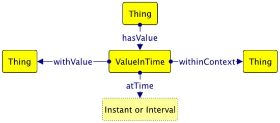Hierarchies of classes, organized through a superclass–subclass (is-a) relationship, form the backbone of ontologies’ structure [42,43,44,45]. To construct these hierarchies, two main methods are typically employed: the top-down approach, which starts from general concepts and refines them into specific subclasses, ensuring logical consistency and comprehensive domain understanding [46]; and the bottom-up approach, which begins with specific concepts and generalizes them into broader classes, particularly useful for well-defined, instance-rich domains [47]. A combined approach was used to develop our ontology’s class hierarchy. Beginning with top-down phases to establish general concepts as root nodes, then progressing to bottom-up phases to identify specific instances and generalize them into subclasses, this hybrid strategy iteratively alternated between both approaches. This integration created a balanced, comprehensive class hierarchy that captures domain complexity accurately and coherently [48]. Furthermore, the ontology adheres to the design patterns of the imported ontologies, among which is TVC, which we used to represent ontological entities with a temporal dimension. Given its relevance to the research presented here, TVC will be explained in detail below in Section 5. Additionally, we developed tools to ensure the ontology remained logically consistent, as well as semantically and syntactically accurate, throughout its development.