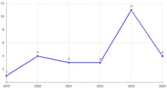 As shown in Figure 1, after the final content filtering, we were left with 26 papers which are included in this study. The distribution of papers based on the publication year is shown in Figure 2, where we had 1 paper from 2019, 4 papers published in 2020, 3 papers published in 2021 and 2022 each, 11 papers from 2023, and 4 papers were published in 2024.