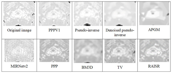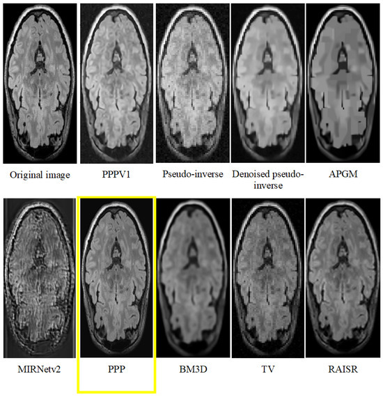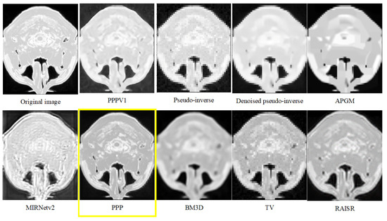 The Wilcoxon signed-rank test was used to compare the PSNR values of the proposed method with the respective values for PPP V1, Pseudo-inverse, Denoised Pseudoinverse, APGM, BM3D, and TV methods for Dataset 1. The results obtained with those statistical tests are shown in Figure 3 and indicate statistically significant differences between the PPP and the other six methods since no per-slice data were available for RAISR and MIRNetv2.