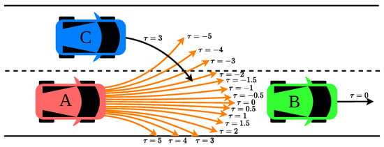 In the complexity calculation, the drivable area of the subject vehicle is determined using the sample-based search algorithm. The parameters are the same as shown in Figure 2. Then, six different scenarios are selected for the dynamic scenario complexity calculation. The steps to calculate the dynamic scenario complexity are described in Section 3.2. A figure for each scenario and the calculation steps are given in the following sections. In each scenario, Vehicle A is the subject vehicle, and the motions of the traffic participants surrounding the subject vehicle are predetermined. The subject vehicle can select any possible trajectory. For the sake of clarity and brevity, only the trajectories are considered when calculating the drivable scenarios D1–D6.