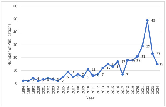 Our study spanned the period from 1996 to 4 May 2024, the date of retrieval. This period was chosen because the first relevant publication on the management and protection of digital IP appeared in 1996.