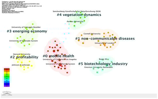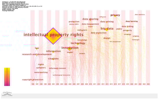 The institution collaboration network clusters are shown in Figure 3; these clusters contain 345 nodes and 382 links. The cluster analysis in CiteSpace is typically employed to group research topics or concepts with similar characteristics, allowing for the differentiation of these groups with distinct labels, thereby highlighting the structure of a specific research domain. Our specific findings are as follows: (1) Research on “#0 mobile health” in the field of data-based intellectual property primarily focuses on data privacy, security, intellectual property rights, data-sharing, compliance with regulations, and ethical considerations. The leading collaboration institutions include the University of California, Los Angeles (UCLA), and the University of California System. The most recent representative research investigates the multidimensional legal aspects of personal genomic sequence data in South African law, focusing on property rights, personality rights, and intellectual property rights, and examines their potential for ownership and the need for harmonization [31]. (2) Some institutions focus on cluster #1, non-communicable diseases, such as the notable collaborations between the University of London and Cornell University. This cluster involves a significant amount of data handling, where protecting intellectual property rights regarding the patient data and research outcomes is crucial. In this type of research, institutions are likely to focus on balancing the need for data-sharing in research with the necessity of protecting patient privacy and data ownership rights. The collaboration outlines a set of guidelines developed to address the complex demands on healthcare institutions when sharing clinical data [32]. They also investigate how competing narratives of data ownership in health research influence data-sharing practices, emphasizing that ethical and social concerns often outweigh formal legal ownership when shaping biomedical data governance [33]. The “#2 profitability” cluster, led by Harvard University and Johnson and Johnson, examines the economic aspects of data-based IP, particularly how protected health data can contribute to profitability in the healthcare sector. (3) The cluster “#3 energizing economy” is directly relevant to the topic of the management and protection of data-based intellectual property. The leading collaboration institutions in this cluster include the University of Colorado Boulder and the University of Colorado System. These institutions primarily collaborate on research on the economic implications of data-driven innovations, particularly in the energy and environmental sectors. Protecting intellectual property in this context is vital for ensuring that data assets are secure and can be effectively leveraged to drive economic growth. (4) The cluster “#4 vegetation dynamics”, led by institutions such as Aarhus University and the Senckenberg Gesellschaft für Naturforschung, focuses on environmental and ecological research. In the context of data-based intellectual property, this cluster explores the management and protection of large datasets related to vegetation and environmental changes. Ensuring the protection of intellectual property in this domain is crucial as ecological data are becoming increasingly important for climate change research and conservation efforts. The most recent representative study proposes a model for managing intellectual property rights in the West African Vegetation Database that incentivizes data-sharing while allowing the owners of the data to retain control over access [34]. (5) The collaboration cluster “#5 biotechnology industry” is also prominent, as represented by the research of Bayer AG and Erasmus University Rotterdam. This cluster is focused on the biotechnology sector, where managing and protecting intellectual property is vital to the development and commercialization of new therapies and technologies. Collaboration in this cluster focuses on developing secure data-sharing frameworks that balance the need for collaboration with the safeguarding of proprietary information in preclinical safety and pharmacology studies.