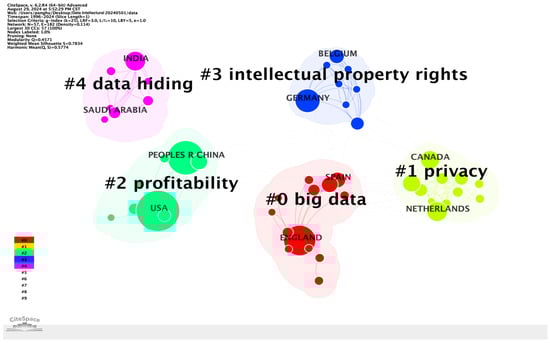 England and Spain tend to collaborate on “#0 big data”. Collaborative efforts in this cluster are focused on developing legal frameworks, data governance policies, and technologies to protect and utilize large datasets effectively [44]. The collaboration between the Netherlands and Canada focuses on “#1 privacy”, particularly the protection of personal data within the context of data-based IP [45,46,47]. Research in this cluster addresses the challenges of maintaining data privacy in a world that is increasingly reliant on digital technologies, with an emphasis on developing privacy-preserving techniques and legal protections that align with international standards. The USA and China collaborate on “#2 profitability”, emphasizing the need to balance profitability and public benefit when managing big data as a public resource. Their collaboration proposes a framework that allows for controlled access to pooled personal data for public purposes, while protecting privacy, and suggests that companies are incentivized to share data voluntarily through regulatory sandboxes and safe harbors [48]. Cluster #3, involving Belgium and Germany, centers on the broader aspects of intellectual property rights. Germany’s involvement emphasizes its role in driving policy and legal reforms in IP protection. The collaboration between India and Saudi Arabia is concentrated on “#4 data hiding techniques”, which are crucial for protecting sensitive information and maintaining data security. This cluster investigates advanced steganography methods, encryption techniques, and the application of these methods to protect intellectual property and ensure the confidentiality of data in various digital applications. The latest research presents a robust data hiding scheme using Block Truncation Coding (BTC) and Hamming code, which is designed to securely conceal data within highly compressed images, enhancing protection against various attacks and improving intellectual property rights and digital security [39].