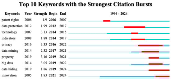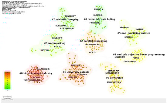 Table 6 highlights the top 10 most frequently co-cited authors in the field of data-based intellectual property’s management and protection. These authors represent central figures within this academic field. The co-citation analysis revealed key authors whose works are frequently referenced together, indicating their significance and influence within the research community. In terms of co-citation, all authors weighted the same. Here are the detailed findings: Jaffe AB is the most frequently co-cited author, with 16 co-citations, followed by Hall BH, with 11, and Samuelson P, with 9. These authors represent central figures within this academic field. Jaffe AB’s research evolved over time: in 1993, he studied how knowledge spreads locally, finding that domestic patents often cite other domestic patents [49]. By 1999, he had shifted to international knowledge flows, looking at how patent citations differ across countries and the role of national borders [50]. In 2000, he analyzed changes in the U.S. patent system over the past 20 years and their impact on innovation [49,51]. Schwartz PM has the highest centrality, at 0.19, suggesting that this author plays a more significant role in connecting various subfields or bridging knowledge areas, despite having only eight co-citations. His work is influential in the academic and policy spheres, as he has also advised international organizations including the European Commission and contributed to the development of data privacy principles. His books Information Privacy Law and Privacy Law Fundamentals are particularly noteworthy. Acemoglu D also has a high centrality (0.18), showing their influence within the network with only seven co-citations. His latest work proposes a mediated data-sharing scheme to address the issues of low data prices and excessive sharing [52]. In addition, we can observe that the centrality scores of the other co-cited authors are comparatively modest and uniform (all below 0.1), suggesting that their influence in this area is comparatively limited. Overall, this analysis helps us to identify potential key influencers that we should watch out for in this field in the future.