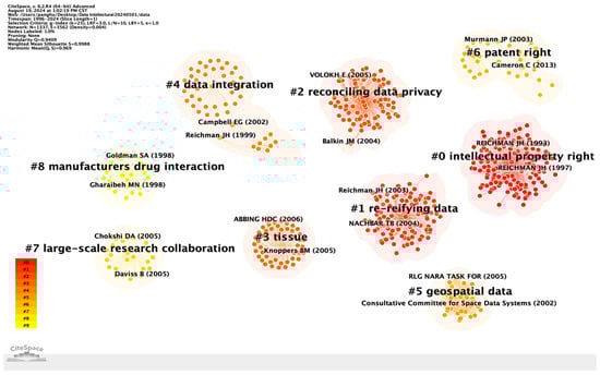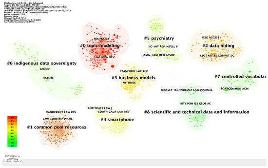 The co-citation journal clusters portrayed in the analysis illustrate the primary research themes related to the management and protection of data-based intellectual property (Figure 7). The network, which contains 959 nodes and 3827 connections, reveals eight significant clusters: “#0 topic modeling”, “#1 common pool resources”, “#2 data hiding”, “#3 business models”, “#4 smartphone”, “#5 psychiatry”, “#6 indigenous data sovereignty”, “#7 controlled vocabularies”, and “#8 scientific and technical data and information”. These clusters represent the key areas of scholarly focus in this field.