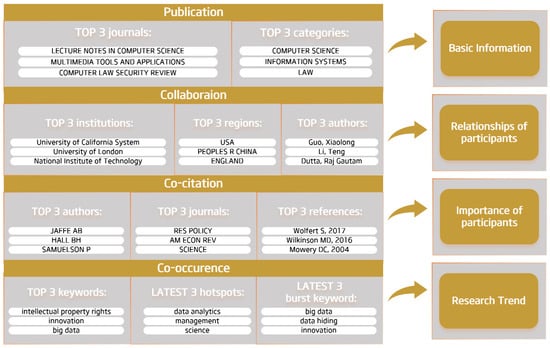 In this study, we use CiteSpace to conduct a comprehensive bibliometric analysis of the management and protection of data-based intellectual property [18]. Specifically, (1) through a collaboration analysis, we investigate the global collaboration networks among authors, institutions, and regions, focusing on their interconnections and overall structures; (2) using co-citation analysis, we identify the most influential authors, journals, and literature in the field, detailing their research focuses and categorizations to guide scholars toward the most critical resources; (3) using a co-occurrence analysis, we explore current research hotspots and anticipate future developments by examining co-occurring keywords and their citation bursts, providing an insight into the field’s knowledge trajectory; and (4) based on the above analyses, we establish a knowledge framework that offers a clear and multidimensional overview of the management and protection of data-based intellectual property while also discussing the current challenges and potential future research directions in the field.