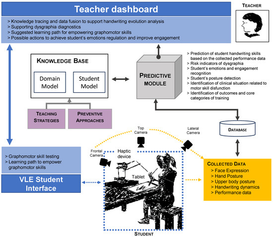 Technologies currently allow us to collect and digitize an important number of parameters and indicators during handwriting, such as acceleration, pressure [62], the inclination of the pen [63], and to focus on micro-movements [64], in particular grip, finger position, fine coordination, hand and shoulder movement, posture, pressure on the sheet/tablet, instead of on macro-movements [34]. For instance, smart pens (e.g., Livescribe or Neo smartpen) can capture handwriting data in real-time, recording key factors such as pressure, speed, and angle while also digitizing handwritten notes. These pens are particularly useful for measuring fine motor movements. Additionally, graphic tablets (e.g., Wacom tablets or iPads) with a stylus (e.g., Apple Pencil) offer the advanced tracking of pressure sensitivity, tilt, and micro-movements. These devices provide high-resolution input, enabling the precise recording of grip, finger positions, and hand coordination. Haptic technology is gaining rising interest for collecting dynamic and spatial information during the drawing task, and is useful for detecting and determining the early dysfunction of motor skills. Affordable and portable haptic systems could be a valid solution to deliver information and complement school-based therapist-directed interventions to improve functional handwriting outcomes [65,66,67]. However, these devices have been evaluated mostly on simple motor tasks (for a review, see [68]), while their effectiveness in supporting more complex tasks like handwriting remains to be confirmed. Moreover, the same haptic devices, used in passive mode, could enable dynamic and spatial information to be collected during the drawing task and used to detect and determine motor skill dysfunctions early. At the same time, to better understand and assess a handwriting pupil’s performance, monitoring the students’ posture and their engagement (or interest) in accomplishing the learning task is of paramount importance [69]. Moreover, information related to students’ emotional behavior should also be collected, as emotional intelligence may support students in the development of more self-awareness and self-management skills [70], impacting on the timing of training for children who present indicators of risk in the development of dysgraphia. To this end, the use of body and hand tracking systems based on RGB cameras (e.g., Ref. [71] seems particularly suitable for monitoring student posture during the handwriting activity, due to their low intrusiveness and low cost). Engagement prediction and emotion recognition systems can be based on various kinds of data. Among them, systems that take advantage of implementing deep learning algorithms to monitor user’s behavior and emotions from the video captured by RGB cameras are the least invasive and probably the most suitable to be used in a learning context. They enable the acquisition of facial expression, eye gaze, and head posture (e.g., [72,73]). The vast majority of these systems are based on Convolutional Neural Networks (CNN) (e.g., Ref. [74]) and allow the identification of the “Big six” of Ekman’s emotions [75] by tracking the movements of the face muscles. Usually, these systems refer to trained models using datasets built in controlled environments, where it is possible to obtain the best accuracy scores, or, trained with data obtained by crawlers on the web, with a low accuracy but mostly reflecting real contexts. Data from all these different sources can be correlated with learning indicators, through data multimodality allowing personalized teaching [76]. Several systems have been proposed to support teachers in evaluating and monitoring students’ graphomotor skills (e.g., [77]) or in training handwriting skills through haptic devices (e.g., [78]). However, no system has yet been developed that integrates both training and evaluation/monitoring capabilities. Additionally, most studies focusing on the evaluation and monitoring of graphomotor skills have primarily analyzed the kinematics and dynamics of graphical strokes. Only a limited number of studies have considered postural information (e.g., [79]), and none have incorporated emotional behavior into their assessments. In this context, this research seeks to develop a new technological framework that offers personalized training for students while supporting the monitoring and selection of the most effective teaching practices. The framework aims to enhance graphomotor skills by considering both students’ performance and behavioral factors, including body and hand posture as well as emotional responses. In summary, this work, while sharing the scientific research that recognizes the risk indicators at the basis of screening protocols, presents an innovative perspective in the design of a technological system more functional to observation and intervention in the school context.