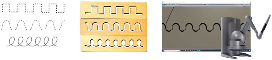 Example of considered graphomotor paths (on the left). Example of wooden graphomotor boards (in the middle). An example of a virtual object used for haptic training (on the right).