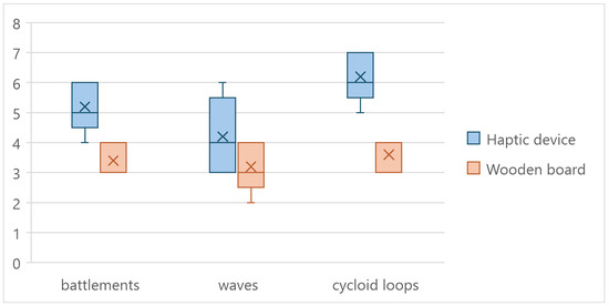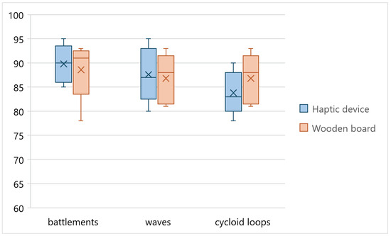 The preference for the haptic tool was reflected in their comments, with all students expressing enthusiasm for the virtual environment and the haptic feedback. In terms of graphomotor tracing quality, expert visual analysis showed no significant differences between the tracings produced by students after training with the haptic device and those completed using the wooden tablets. The evaluations showed an average accuracy of approximately 87% for tracings completed after exercises on both the haptic device and the wooden tablets (Figure 4), suggesting no measurable differences in performance quality between the two tools. Overall, these results suggest that haptic devices can be a feasible and engaging tool for graphomotor training among preschool children.