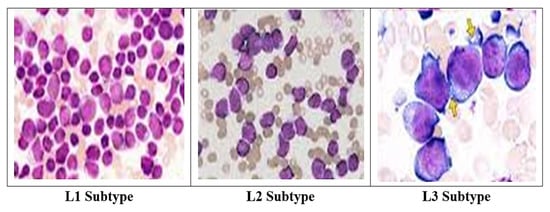 - Rao, P.V.; Rustum, R. Acute Leukemia Types and Sub Types Detection. In Proceedings of the 3rd International Conference on Inventive Research in Computing Applications, ICIRCA 2021, Coimbatore, India, 2–4 September 2021; Institute of Electrical and Electronics Engineers Inc.: Piscataway, NJ, USA, 2021; pp. 531–533. [Google Scholar] [CrossRef]