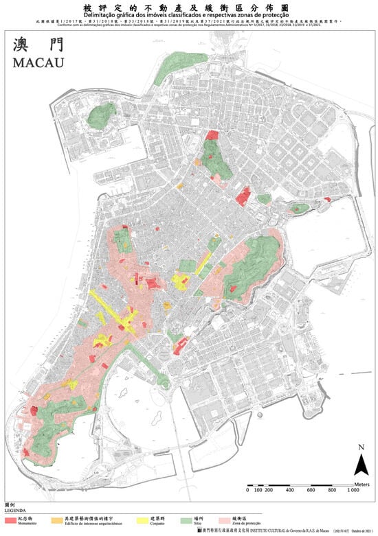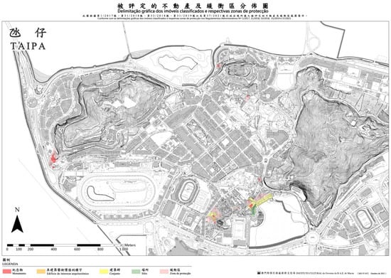 - Law 11/2013 of Macau on the Protection of Cultural Heritage, Government of the Macau Special Administrative Region. 2013. Available online: https://bo.io.gov.mo/bo/i/2013/36/lei11_cn.asp (accessed on 20 September 2023).