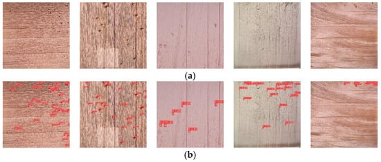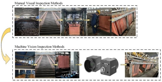 In industrial production, high-purity copper cathodes are commonly produced through electrolytic refining. However, during the process of purification, convex nodules and particles appear on the surface of the cathode copper plate. These nodules grow continuously and eventually make contact with the anode, resulting in a short circuit between the cathode and anode, which ultimately leads to a significant decrease in current efficiency and deterioration in the quality of the copper plate [1,2]. Current research indicates that the formation of nodules on copper cathode plates is caused by a combination of multiple factors. For instance, during the electrolysis process, the dissolution of the anode leads to the production of solid particles, such as anode sludge, which adhere to the surface of the cathode copper plates and induce nodule formation [3]. Improper use of additive components and their ratios can cause roughening of the cathode copper plate surface, thereby increasing the risk of nodule formation [4]. Additionally, uneven current distribution often leads to nodule formation on the cathode copper plates. If the cathode is tilted, the current increases significantly in the area closer to the anode, thereby raising the likelihood of nodule formation [5]. However, in actual industrial production environments, the factors contributing to nodule formation on copper plates are highly complex and difficult to avoid completely. The occurrence of nodulation on the surface of a copper cathode plate not only deteriorates the quality of the copper plate but also impacts downstream production processes, making the detection of nodulation defects essential. Currently, the detection of nodule formation on the surface of cathode copper plates primarily relies on manual visual inspection methods [6,7], as illustrated in Figure 1. This method is often influenced by subjective human judgment, making it challenging to ensure detection accuracy. Additionally, the manual identification method faces several challenges, including high labor costs, low identification efficiency, and a lack of capability for continuous identification tasks. Therefore, it is of great significance to develop an efficient and accurate algorithm for detecting nodules on copper cathode plates. This algorithm aims to reduce labor costs in production, improve industrial efficiency, and promote the advancement of intelligent manufacturing.