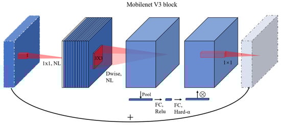 To minimize the number of parameters and computations in the model, the feature extraction network utilizes the lightweight MobileNetV3 [34], employing depthwise separable convolution instead of traditional convolution, adding the SE attention mechanism module, and introducing the nonlinear activation function, h-swish, which further enhances the model’s performance and generalization capability. Figure 3 illustrates the structure of MobileNetV3.