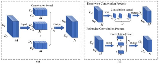 Depthwise separable convolution comprises two essential components: depthwise convolution and pointwise convolution. In depthwise convolution, the unique characteristics of each channel in the input feature matrix are effectively extracted by applying the convolution kernel to each channel, resulting in an equivalent number of feature maps. This approach reduces both the floating-point computations and the parameter count compared to standard convolution. In pointwise convolution, the input features are convolved with a 1 × 1 convolution kernel. This process is repeated times to increase the number of channels to layers. The processes of traditional convolution and depthwise separable convolution are illustrated in Figure 4.