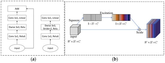 (a) Inverted residual structure of MobileNetV3; (b) Schematic diagram of SE network structure.