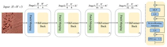 The network architecture of the BiFormer attention mechanism, which employs BRA as a fundamental building block for constructing a four-stage pyramid structure, is illustrated in Figure 6. The initial phase involves embedding overlapping patches. During the second to fourth stages, patch merging modules are employed to reduce the spatial resolution of the input while increasing the number of channels. Subsequently, consecutive BiFormer blocks are applied to modify the features. Each BiFormer block initially encodes relative position information by utilizing a 3 × 3 deep convolution. Subsequently, a two-layer routing attention mechanism module and a two-layer MLP module, with an extension ratio of , are employed to model the cross-position relationships and the embedding positions.