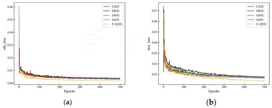 The F-EIOU bounding box loss function is designed to address the issue of sample imbalance and to introduce consistency penalty terms and adaptability parameters. This enhances the model’s robustness and contributes to improved training efficiency for the network. The neural network’s predictions and expected values can be evaluated using three types of loss functions. The closer the predictions align with the expected values, the lower the value of the loss function. Figure 8 illustrates the variations in box_loss and obj_loss for the F-EIOU loss function compared to the CIOU, DIOU, GIOU, and EIOU loss functions after 500 training epochs. The results show that the obj_loss of the F-EIOU loss function converges faster than that of the other loss functions. Additionally, for the same training epochs, the F-EIOU loss function demonstrates lower values for both obj_loss and box_loss. This indicates that the enhanced model demonstrates superior convergence speed and reliability, facilitating more accurate image sample recognition.
