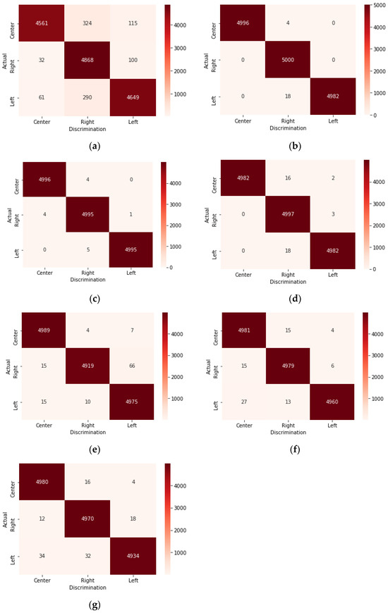 Confusion matrix by classifier. Figure shows the total sum of the confusion matrices for all subjects. The confusion matrices for each classifier are (a) SVM, (b) RF, (c) KNN, (d) MLP, (e) ADB, (f) QDA, and (g) NAB.