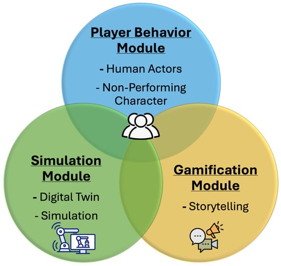 The image depicts the three modules of our proposed framework: Player Behavior Module, Gamification Module, and Simulator Module.