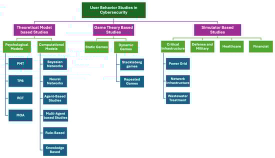 Understanding user behavior during cyber attacks is crucial for developing effective cybersecurity strategies. Several methodologies have been used in the literature to study user behavior during cybersecurity attacks. These methodologies can broadly be classified into three categories: theoretical modeling-based, game theory-based, and simulator-based approaches, as depicted in Figure 2. Each offers unique insights and tools for analyzing the actions of defenders, attackers, and general network users. By examining these methodologies, we identify gaps in current research and potential opportunities ahead.
