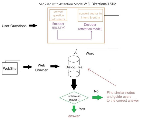 From the above surveyed NLP techniques [18,21,22,25,26,27,28], we adopt the typical state-of-the-art Seq2seq as the model, introduce the concept of the attention mechanism, and use bi-directional LSTM as the layers. In Seq2Seq, after the user asks a question, the question is input to the first encoder model, which converts the input sentence into context vectors. These are then fed into the second decoder model to extract words most likely to be the intent and entities. In terms of natural language processing, the advantage of our study is that no special training is required for the target domain because the method adopted is to analyze the grammar to find the keywords. Combined with a crawler and dialogue tree, the knowledge base can be rapidly expanded. Ultimately, realize a cross-domain intelligent customer service. As we know, this study is the first proposed web service by integrating web crawler and Seq2seq. Overall, Seq2Seq models remain a valuable tool in the NLP toolkit, particularly for tasks where the simplicity and interpretability of RNN-based architectures are beneficial.