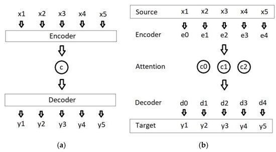 The attention mechanism [30], as shown in Figure 3b, was initially proposed to address the problem of significant performance degradation in machine translation as sentence length increases. The paper’s authors treat machine translation as an encoding-decoding problem, encoding sentences into vectors and decoding them into the content to be translated. However, in the Seq2Seq model, the encoder compresses the entire sentence into a fixed-length vector, which makes it challenging to save enough semantic information when the sentence is long. The role of the attention mechanism is to create a context vector for each word or word of the input sentence rather than just making a single context vector for the input sentence. The advantage of doing this is that the context vector generated by each word can be decoded more accurately.