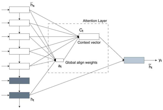 This study uses the encoder-decoder architecture (Seq2Seq) for natural language processing. Bi-directional LSTM is used in the encoder to increase the accuracy of sentences in the case of polysemy. The Luong Attention Mechanism [30] is added to the decoder, as shown in Figure 6 [32], which improves the accuracy problem decreasing as the sentence length increases.