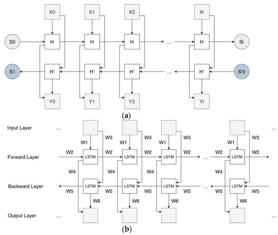 The problem with unidirectional RNN/LSTMs is that they can only make predictions from information before the current time t. But in practice, a sentence sometimes needs to use future information to make predictions. Its mode of operation is that a hidden layer can be left to right or right to left. With a bidirectional RNN/LSTM, we can make better predictions about words. For example, “I want to buy a Mac” and “I love apples”. In these two sentences, if you only read “I want to buy an Apple computer”, you may not know whether Apple refers to fruit or mobile phone. But if you can get the message from the latter sentence, the answer is obvious. Figure 5a,b show the improved RNN and LSTM, respectively, bidirectional RNN [31] and LSTM [32].