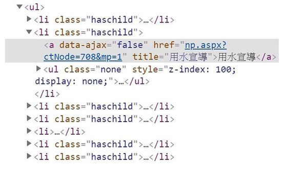 Taking the Taiwan Water Company [36] as an example, the web page must be analyzed first. After analysis, it was found that most of the catalogs of the company are marked in the <ul> and <li> tags, as in Figure 7, and there are apparent tags such as class=“child”. So, find all the hyperlinks <a href> for these rules and use the DFS algorithm to crawl down layer by layer. In this way, a preliminary tree can be generated. After manual trimming, the final dialogue tree can be produced, as in Figure 8.