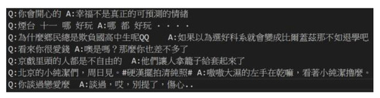 The experiment uses the data compiled by codemayq [38] for the open-source Chinese chat data; some examples are shown in Figure 9, including from Chatterbot, Douban, PPT, Qingyun, TV drama dialogue, Tieba forum, Weibo, Xiaohuangji and other websites containing various dialogue materials. Many of these sentences have familiar Martian texts, such as ㄏㄏ, QQ, etc., that must be filtered and pre-processed.