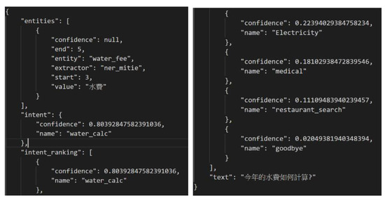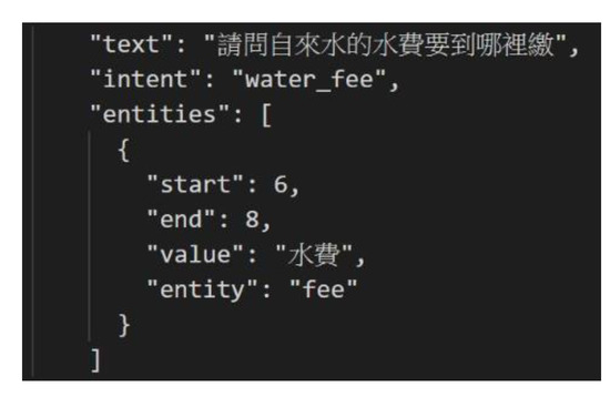In this experiment, the Sklearn + Jieba + MITIE packages are used to train the RasaNLU, which has some advantages. First of all, the source data must be marked. This study takes the Taiwan Water Company as an example. Text is the input sentence, the intent is the purpose, and the entity is the keyword of the input sentence, as shown in Figure 10.
