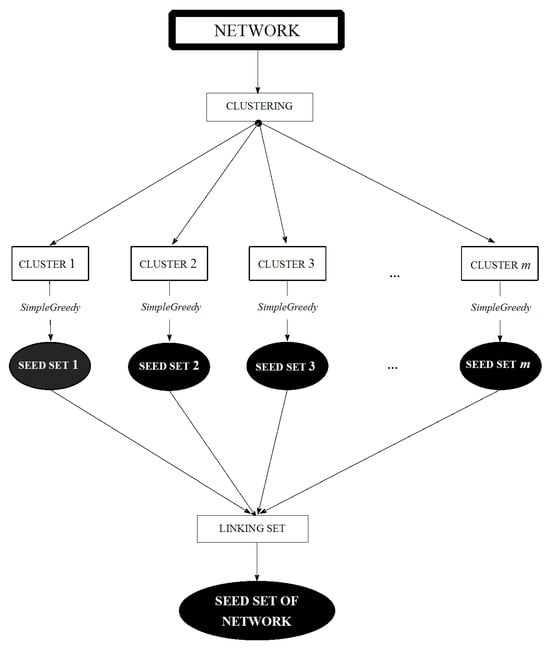 This paper presents a novel algorithm named ClusterGreedy (Algorithm 3) that combines the SimpleGreedy (Algorithm 2) with graph clustering. The main idea is to create a partition of the set of nodes using clustering techniques. Each subset of nodes obtained from the partition induces a smaller subgraph. Then, we apply the SimpleGreedy to each subgraph to generate a set of candidate nodes for the seed set. Then, a subproblem called the linking set problem is solved to obtain the best seed set from the combination of the sets of candidate nodes generated for each subgraph. We present an overview of the ClusterGreedy algorithm in Figure 1. The purpose of this approach is twofold. On one hand, we aim to reduce the running times since the evaluation of the marginal gains (which is the most expensive task from the computational point of view) is conducted on smaller subgraphs. On the other hand, as the SimpleGreedy approach is heuristic and known to be myopic, by leaving to a second step, the choice of the final seed set may help to obtain better solutions.