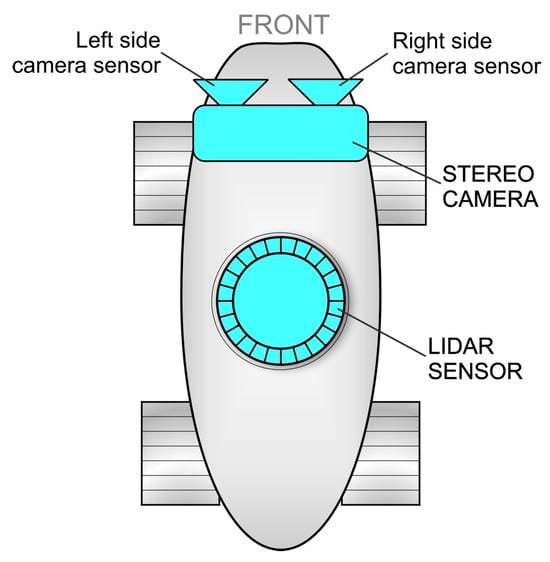 Both single and stereo camera configurations are limited to providing the agent with the information from the forward direction. A LiDAR can be added to increase the agent’s awareness of the situation in other directions. This helps the car to perform manoeuvres such as lane changes or turns without crashing into an obstacle or another car that might be to the side and not visible to the front-facing cameras. The layout of the sensors on a Deep Racer model can be seen in Figure 2.
