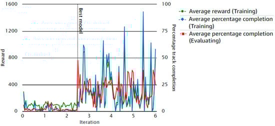 Most of the articles focused on creating solutions with the DeepRacer agent for obstacle-free environments [53]. Another paper presented a novel system framework for the Vehicle Network Autonomous Racing Model (VNARM) [54]. The vehicle’s ability to complete a lap improved drastically, reducing the time by up to three times compared to the baseline solutions [14], while still achieving a high completion rate.