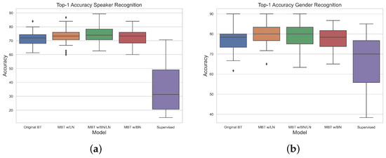 Building on this setup, the empirical results are illustrated in Figure 4a. This plot reveals the Top-1 accuracy of different models in the context of speaker recognition. We first note the original BTs model, which exhibits a median accuracy of around 70%, paired with a relatively symmetrical interquartile range (IQR) and outliers that suggest variations in performance. In contrast, the MBT w/LN model demonstrates a similar median but with a notably tighter IQR, indicating more consistent results. A slight deviation is observed in the MBT w/BN/LN model, which has a marginally lower median accuracy and a larger IQR, pointing to greater variability in its performance. A notable divergence is seen in the MBT w/BN model, characterized by a much wider range and a lower median accuracy, with outliers indicating instances of particularly low performance. Interestingly, the supervised model markedly stands out with a a significantly lower median accuracy and a large IQR, underscoring its consistent underperformance relative to the other models. The presence of outliers, especially noticeable in the original BT and MBT w/BN models, suggests instances where the models either excel or fall dramatically short. Overall, the MBT models incorporating layer normalization (LN) appear to strike a desirable balance between achieving high accuracy and ensuring result consistency, while the supervised model exhibits considerable limitations in accuracy for this specific task.